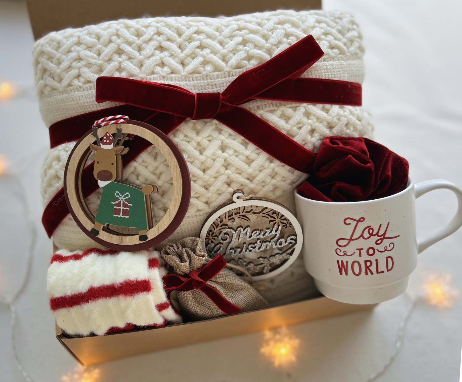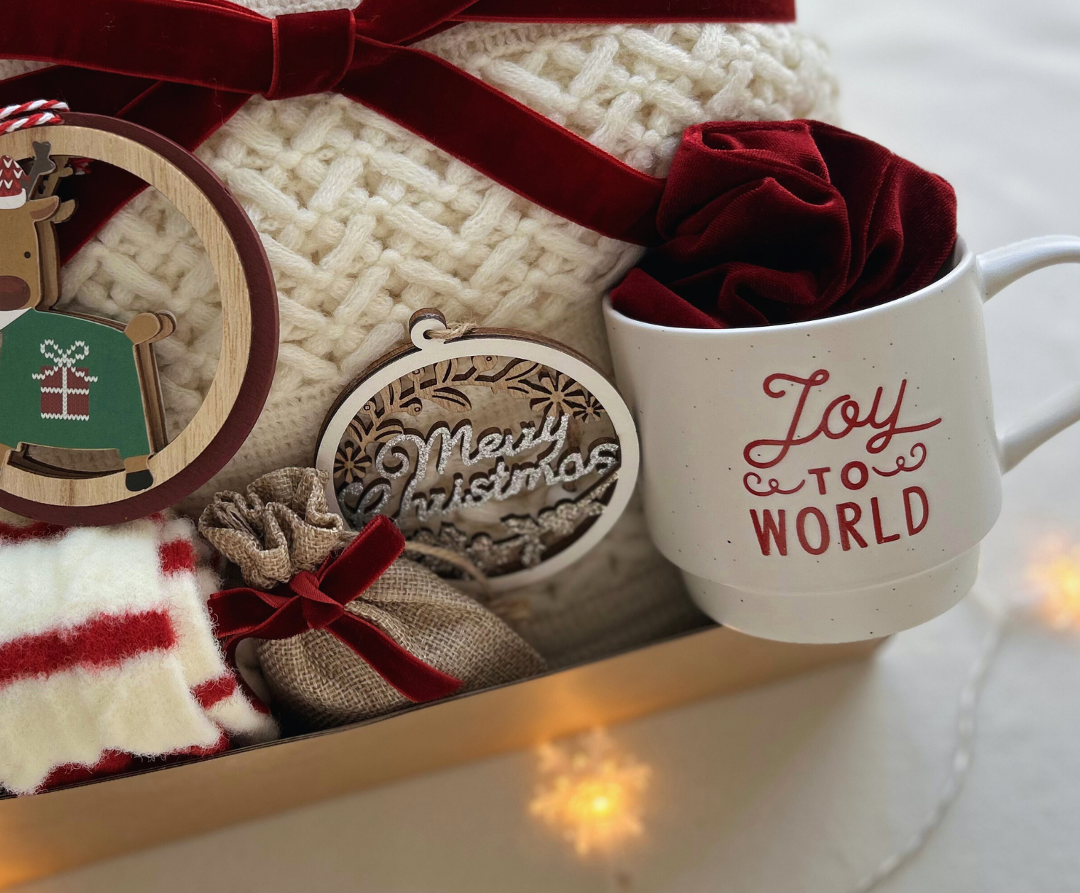 Burgundy Velvet Christmas Gift Basket for Family & Friends with Blanket & Mugs