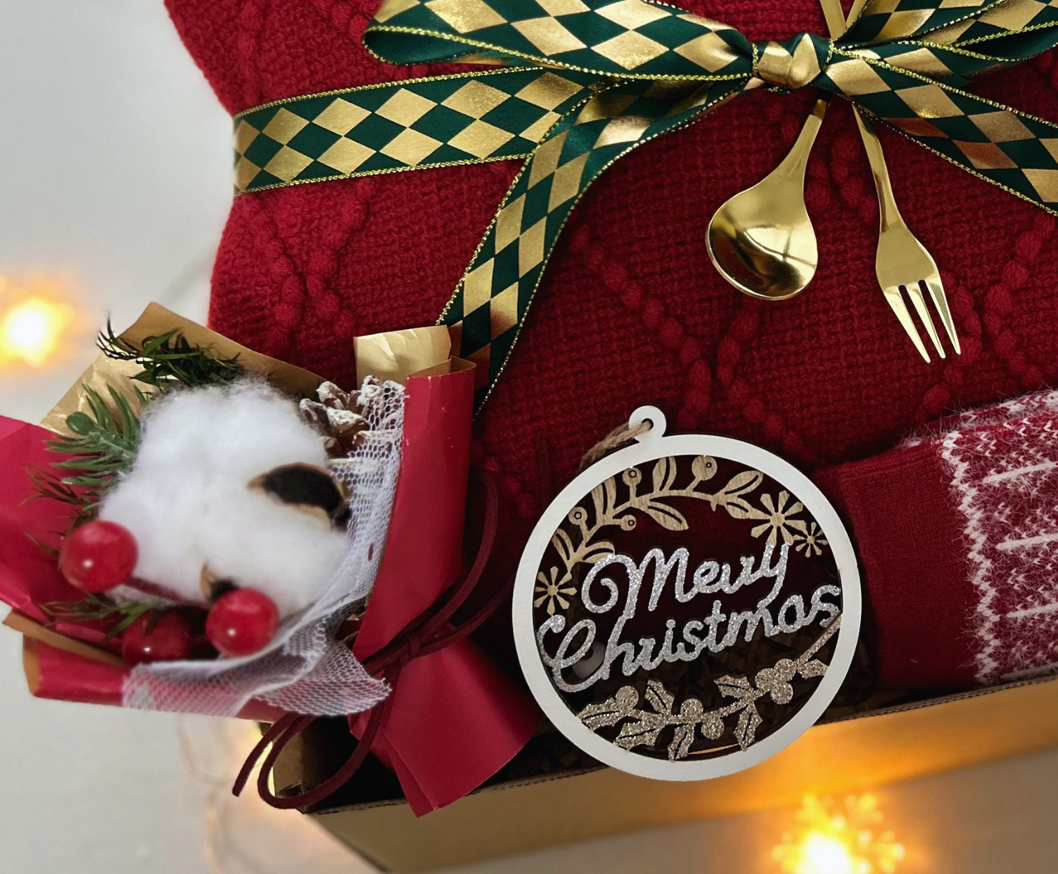 Delight her this holiday season with a Christmas gift basket full of festive fun! Snuggle up with a cozy burgundy knit blanket and step into the warmth of whimsical reindeer wool socks. Enjoy the sparkle of a mini Christmas bouquet and the charm of Santa’s forks to add a playful twist to holiday meals. Topped off with a wooden ornament and a personalized card, this basket is sure to bring smiles and a sprinkle of holiday magic.