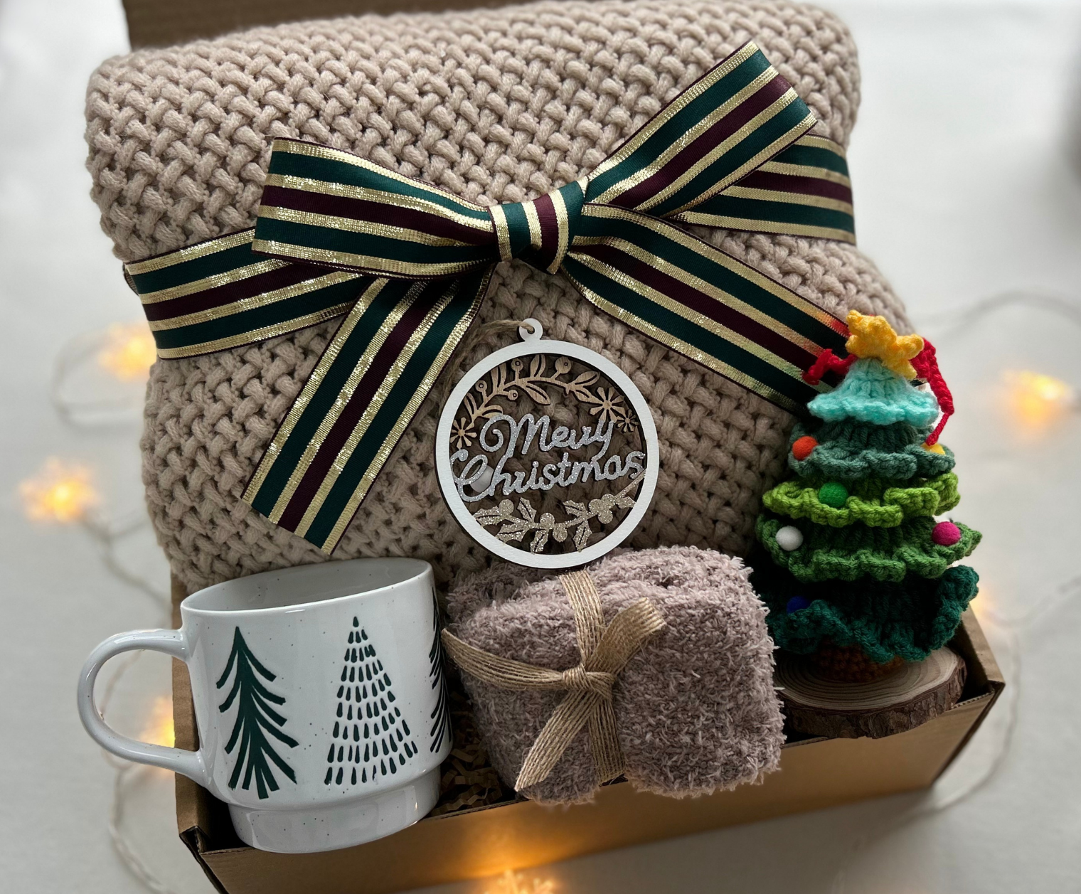 This Christmas gift basket is the perfect way to show your loved ones you care. It includes a cozy 50"x60" winter knit blanket to keep them warm, a festive Xmas tree glass mug for holiday cheer, and soft cozy socks for comfort. Handcrafted touches like a crochet Christmas tree and a wooden ornament add heartfelt charm, while a personalized card lets you share your warmest wishes. Ideal for family and friends, this thoughtful bundle brings holiday spirit and comfort in one beautiful package.