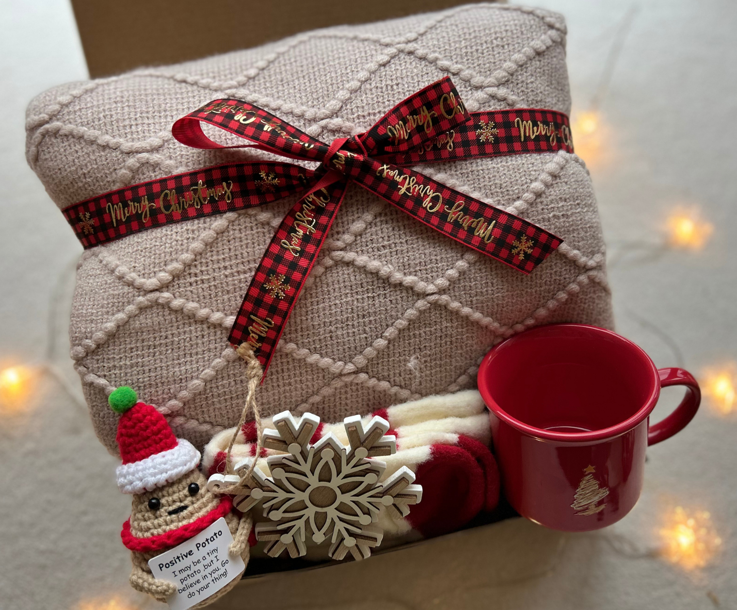 Wrap your holiday season in warmth and cheer with this Christmas Gift Box. Featuring a soft 49"x69" cozy blanket, festive Christmas mug, and snug Christmas-themed socks, it's perfect for relaxing by the fire. The unique Christmas crochet positive potato adds a charming, handcrafted touch, complemented by a delicate wooden snowflake pendant. A personalized card completes this thoughtful package, making it an ideal gift to spread joy and comfort to your loved ones.