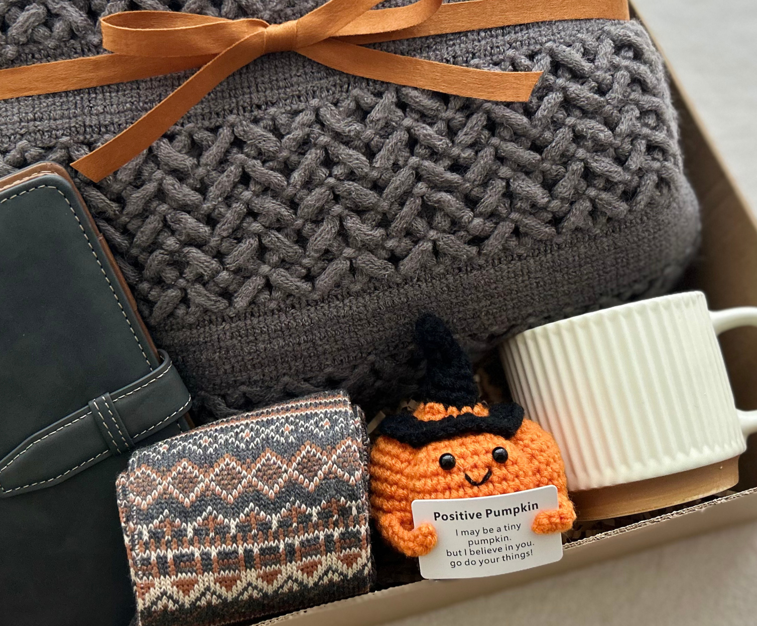 Wrap him in warmth and comfort with this Cozy Care Package. Featuring a soft gray crochet blanket and an adorable emotional support pumpkin, it offers both coziness and companionship. Included are a stylish mug for his favorite drink, snug socks to keep his feet warm, a faux leather notebook for jotting down thoughts, and a personalized card to make it truly special. Perfect for showing care and lifting spirits, this thoughtful bundle combines practicality with heartfelt touches.