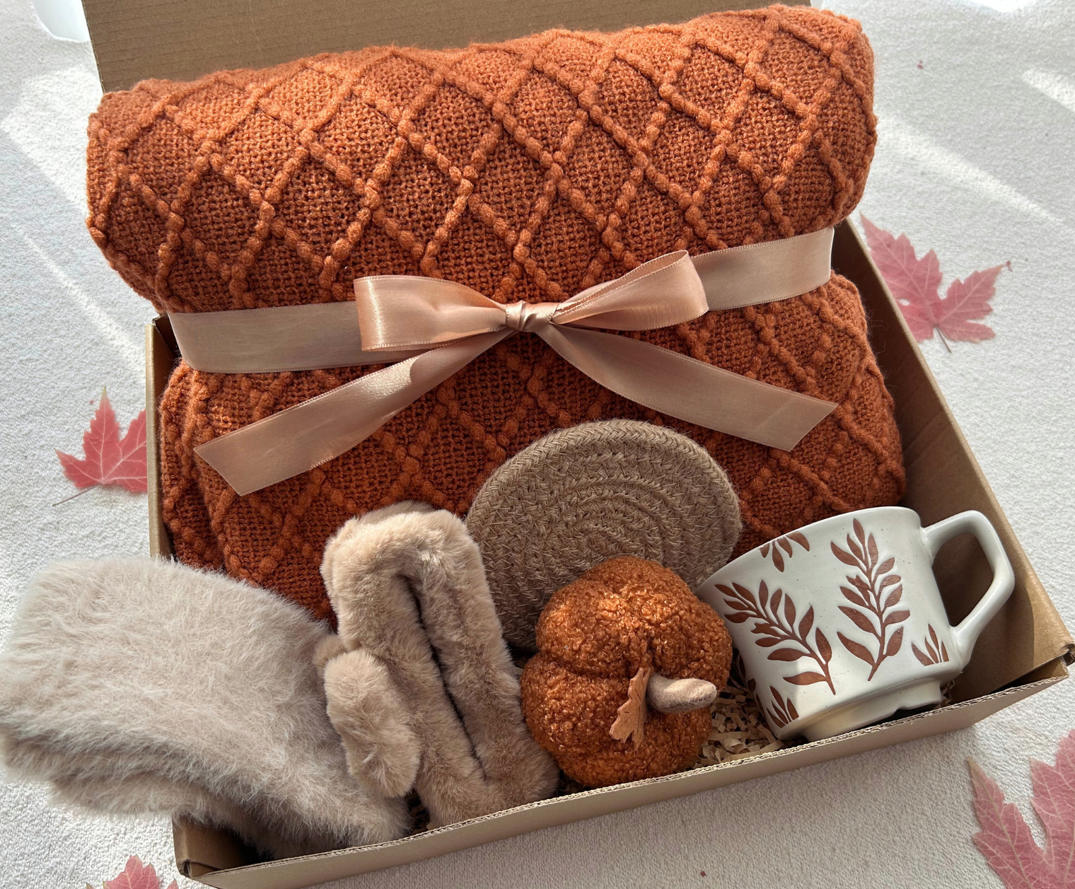 Embrace the warmth of the season with this Fall Season Care Package Basket designed for women. It features a thick, cozy 50" x 60" blanket with charming tassels, perfect for snuggling up on chilly evenings. Enjoy your favorite hot drink in the included ceramic mug while staying comfy with fluffy socks. A faux fur hair claw adds a stylish touch, complemented by cute pumpkin decor to brighten any space. Personalize your gift with a heartfelt card, making this bundle a thoughtful and irresistible seasonal treat.
